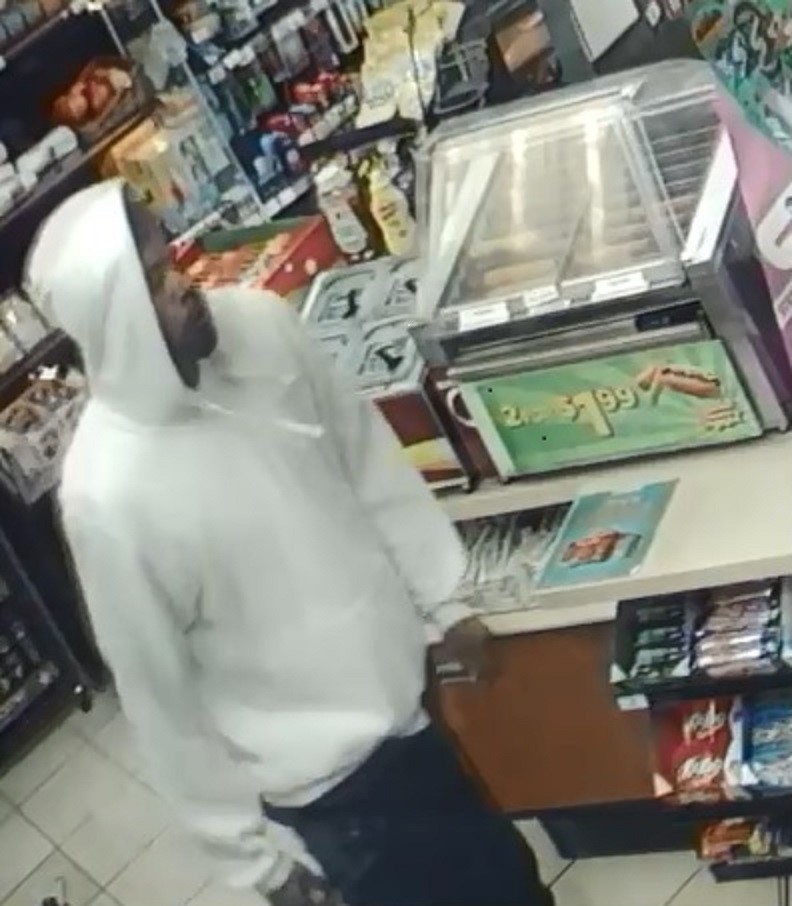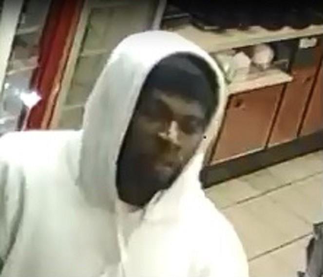 The suspect is described as a black male adult, 5-8 to 5’-10”, 160-170 pounds, wearing a black beanie, white hoodie, black jeans and white shoes.